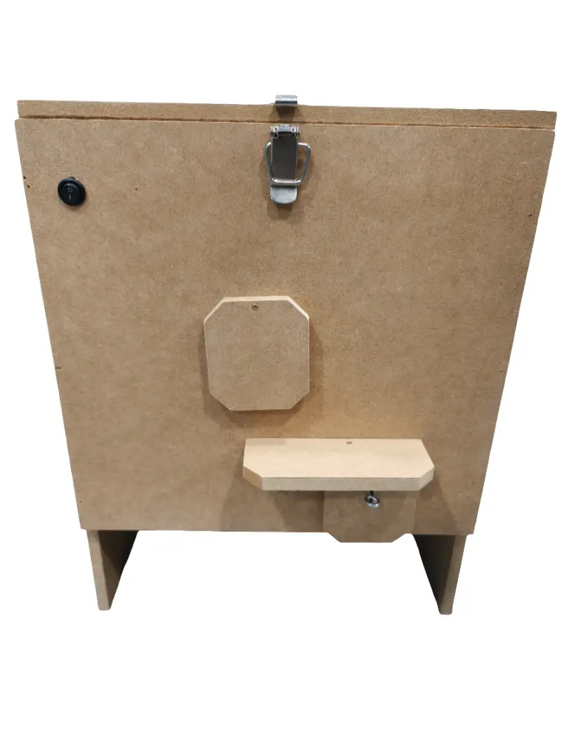 Cabina fotográfica de gran calidad hecha de madera, Con trípode para la movilidad del posadero y poder obtener imágenes del pájaro en diferentes posiciones. Iluminación interna con luces LED,