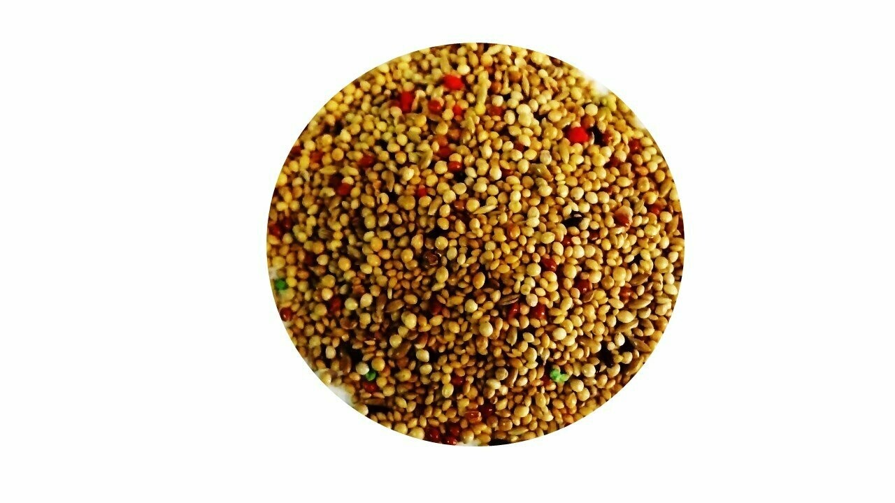 Mijo blanco, mijo rojo, panizo, alpiste limpio, negrillo y galletas de colores.